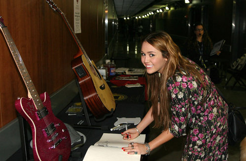 Miley Cyrus si è poi fermata nello stand diMusiCares, un’iniziativa dei Grammy per sostenere tutti gli artisti che si trovano in difficoltà economiche. Nella foto qui sopra la vediamo mentre firma il libro delle presenze di MusiCares.